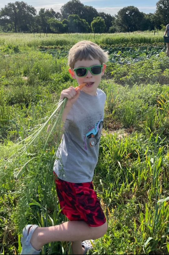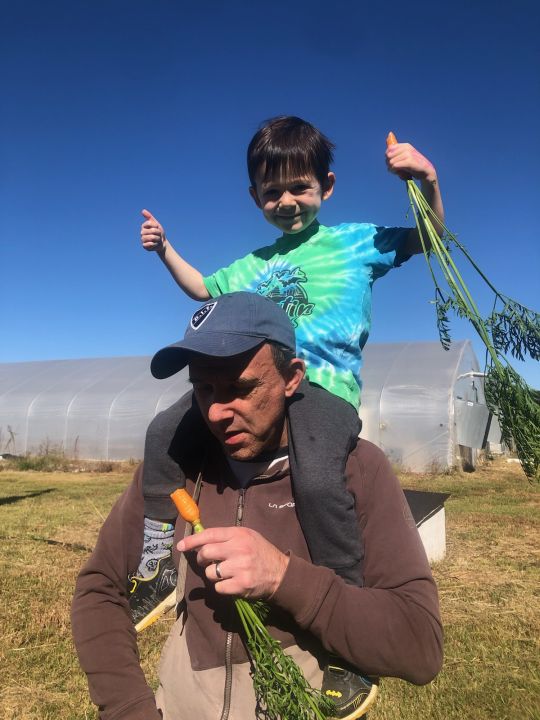 David with Calvin on his shoulders enjoying fresh picked carrots