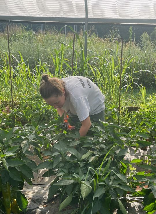 Katherine harvesting peppers in the high tunnel