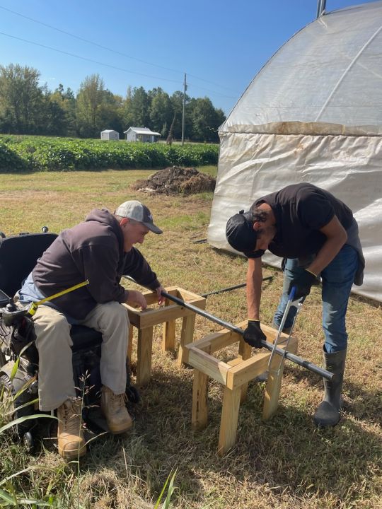 Randy (L) and Robin (R) cutting poles as they work on repairing a high tunnel
