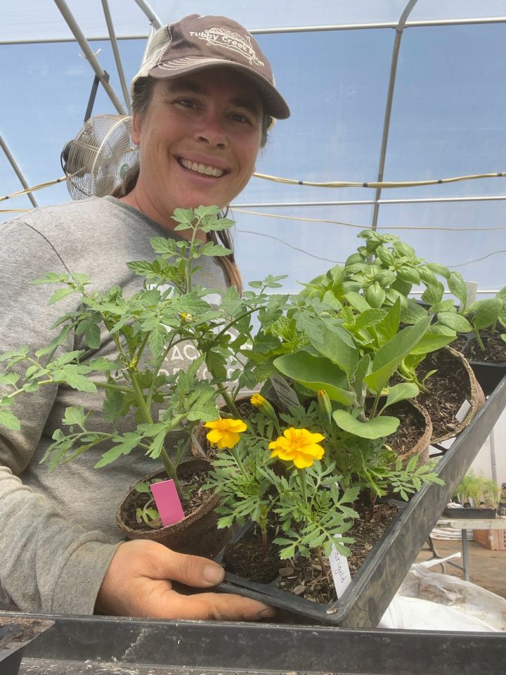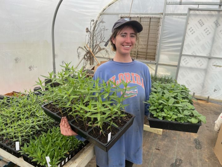 Meg holding some native plants that will be for sale in May