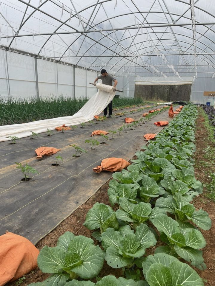 Robin is rolling up the frost cloth in the high tunnel. These tomatoes are getting an early start. Even in the high tunnel if low temperatures come back we will cover the tomatoes up