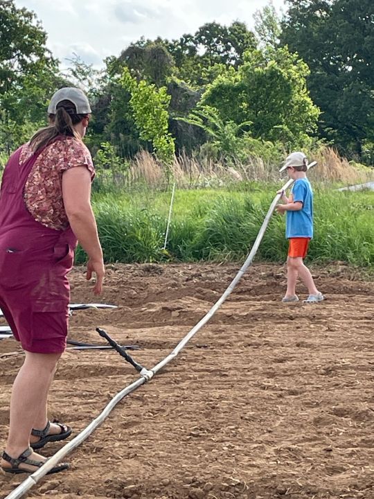 Cooper helping Josephine set up the header for the drip irrigation