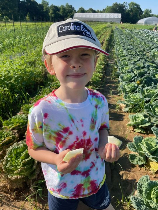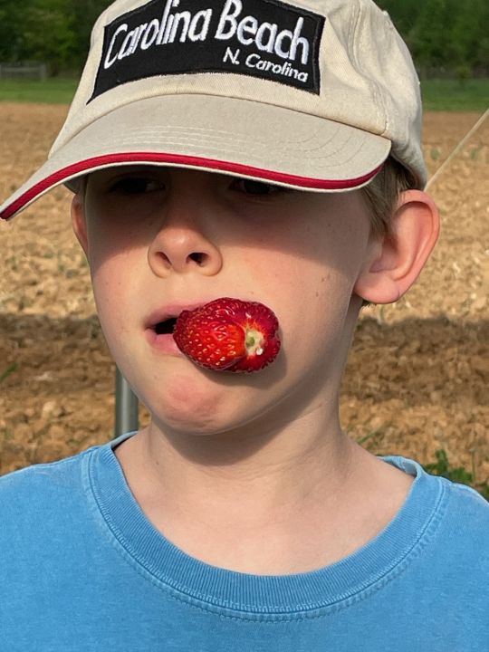 Cooper the “Strawberry King” chomping on a giant strawberry he just picked