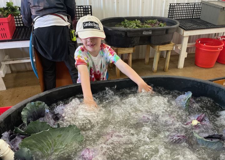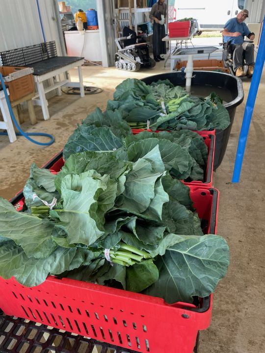 Collard bunches for CSA about to be rinsed