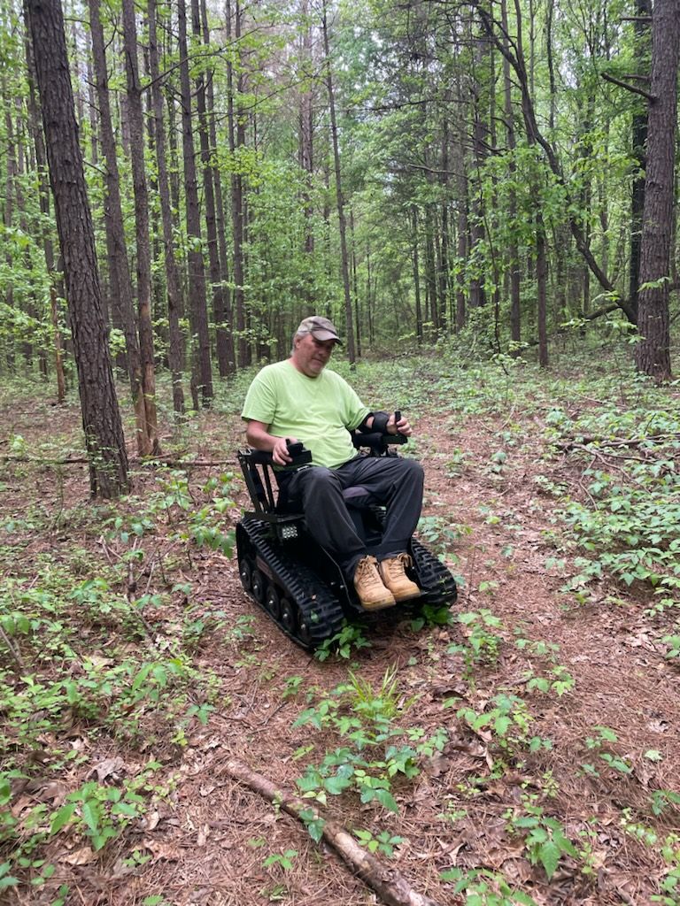 Randy in his new EcoRover track chair going down a path in the woods