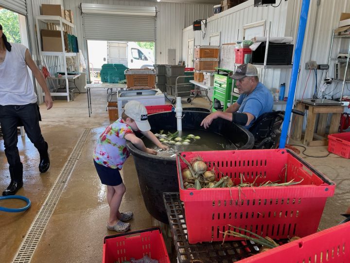 Randy and Cooper washing onions