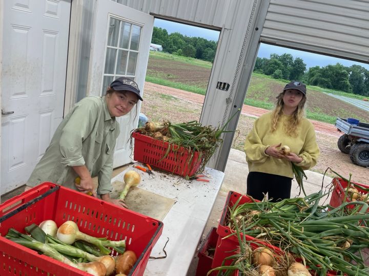 Katherine and Meg processing onions from the high tunnel