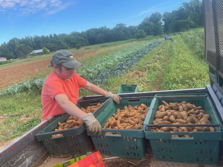 Katherine loading fingerling potatoes into the bed of the Mule