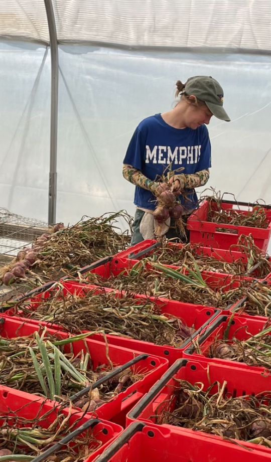 Katherine in the greenhouse laying out onions to sure.