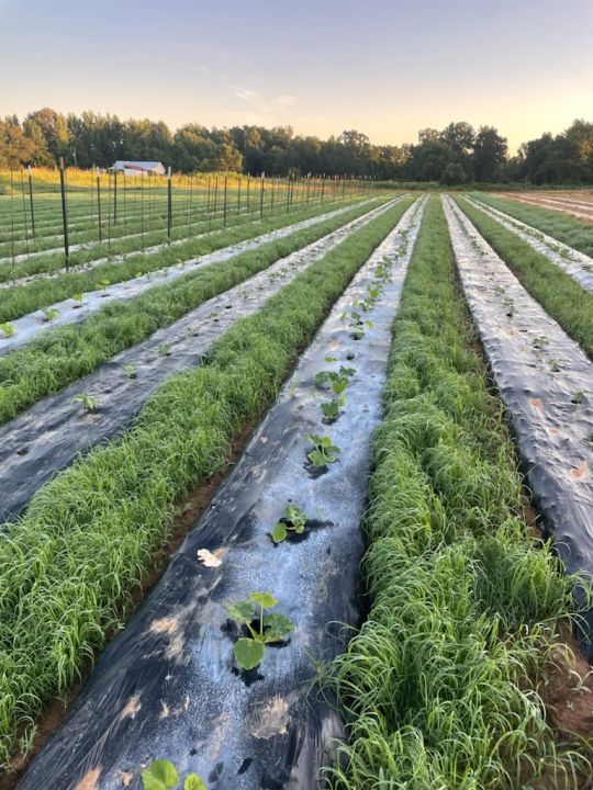 The okra was planted late but it’s coming on strong. You can also see the freshly mowed Teff grass in the pathways