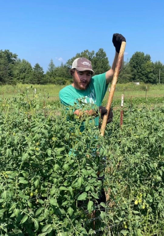 Joseph trellising field tomatoes.