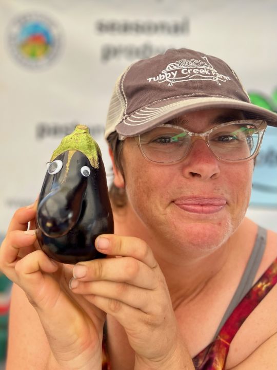 Josephine posing with googly eyed eggplant. Thanks Stephanie for this picture