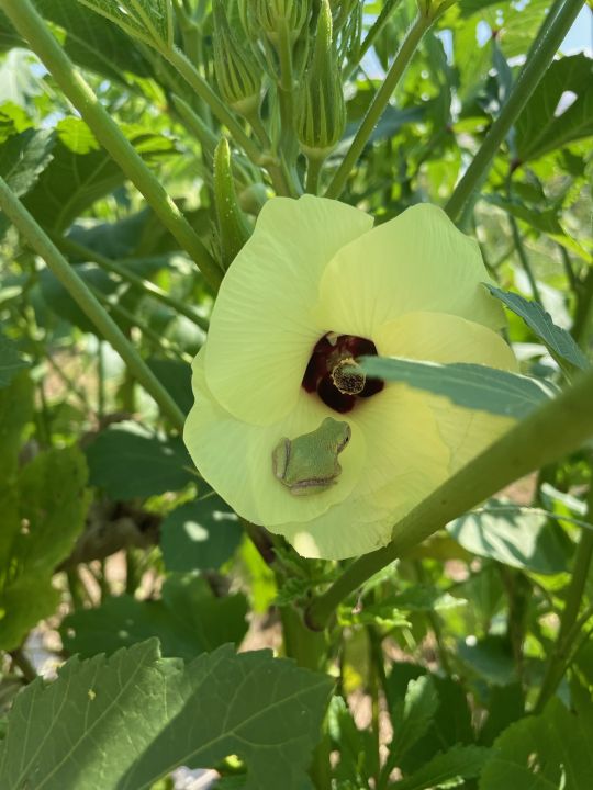Little green frog just waiting for some small pollinator to come along