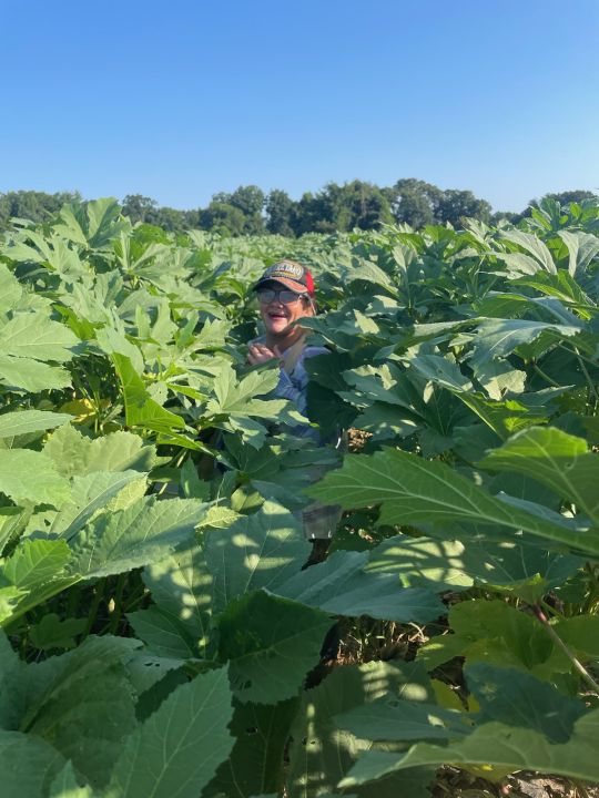 Finally the okra is starting to produce. Here Meg is picking okra into fruit harvesting basket hanging on her shoulders.