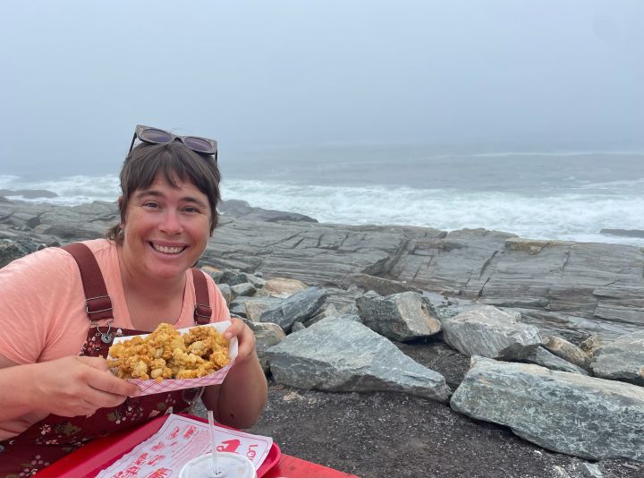 Josephine enjoying fried clams from the Lobster Shack