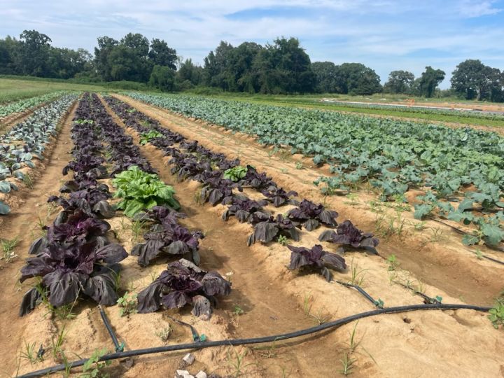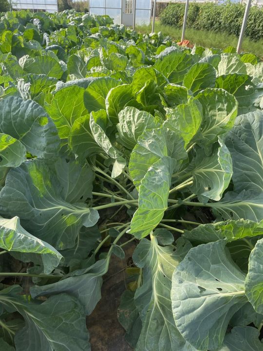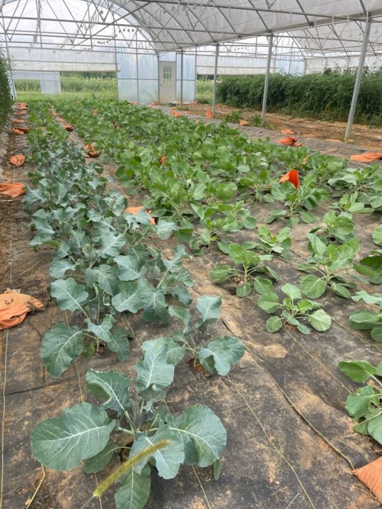 In this high tunnel there are broccoli foreground and Brussels sprouts