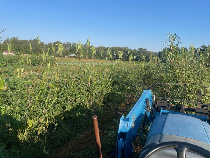 Randy mowing down one of two patches of okra