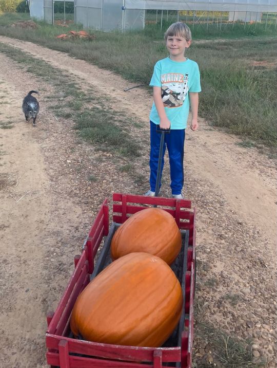 Cooper harvested two really big pumpkins from our little test patch