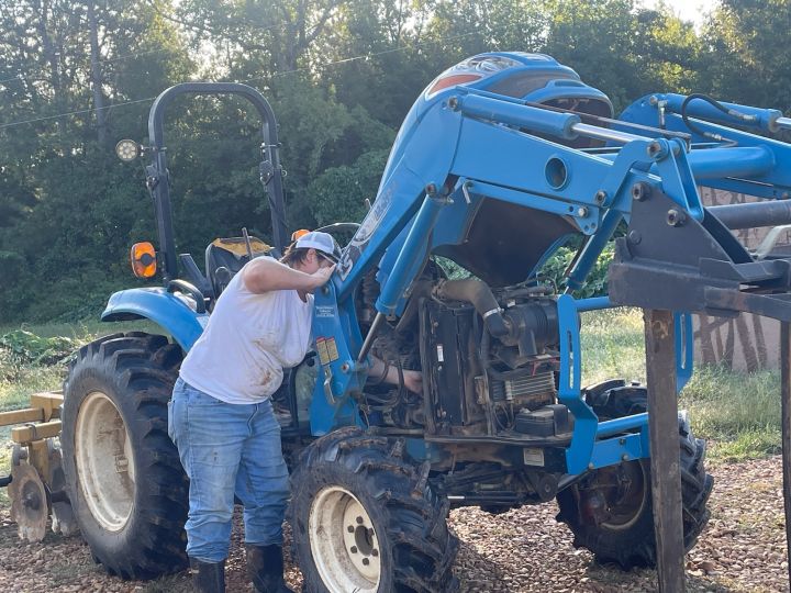 Josephine changing the fan belt on Ol’ Blue