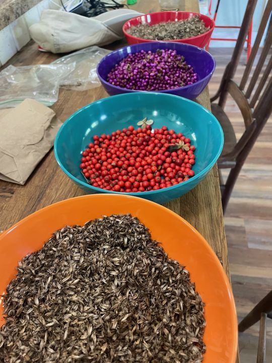 Four bowls of different native plants seeds. Preparing for our native plant sale in 2025