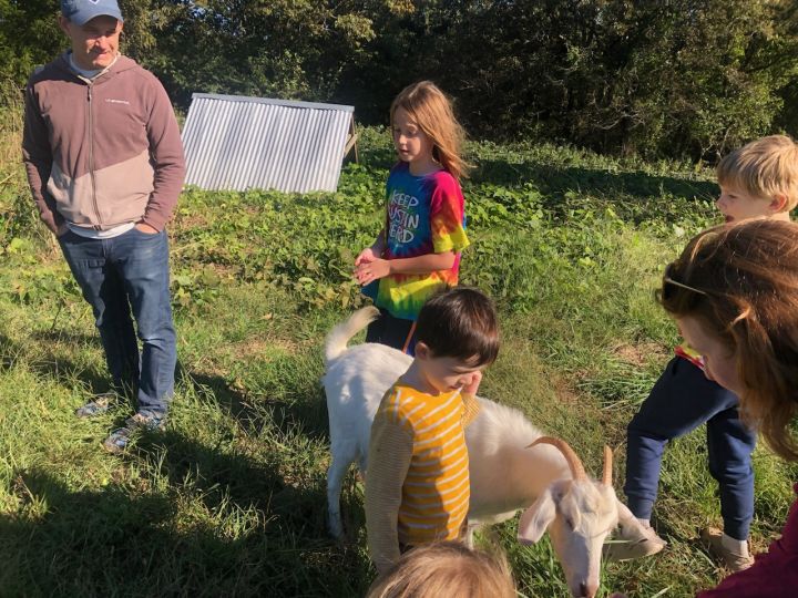 David (L), Oscar (Middle background), Ca;lvin (front center) and Cooper (R) and others spending a moment with our goat, Peanut