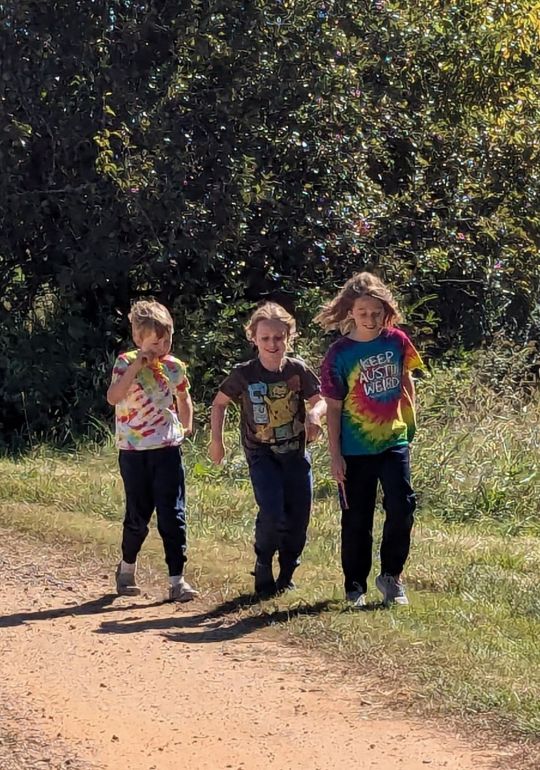 Cooper, (L), Guy, (C) and Oscar, (R) on a walk around the farm