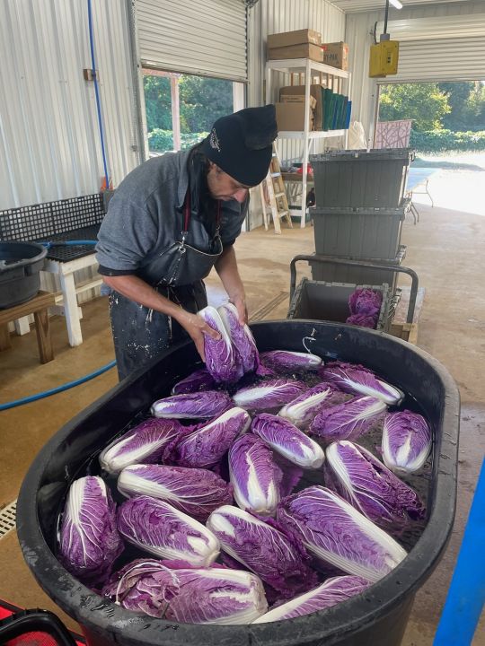 Robin washing the purple Napa cabbages