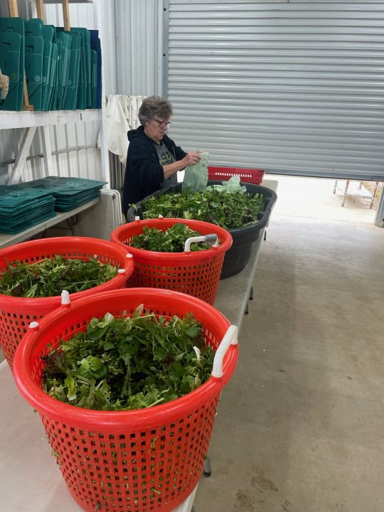 Connie weighing and packing salad mix for the CSA