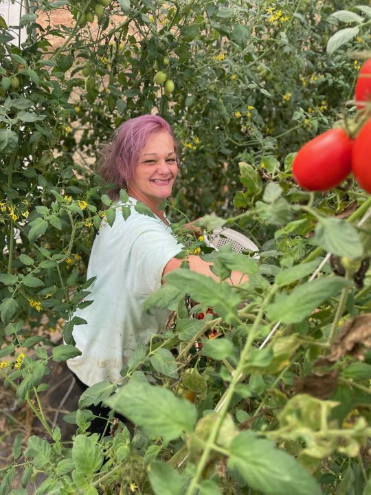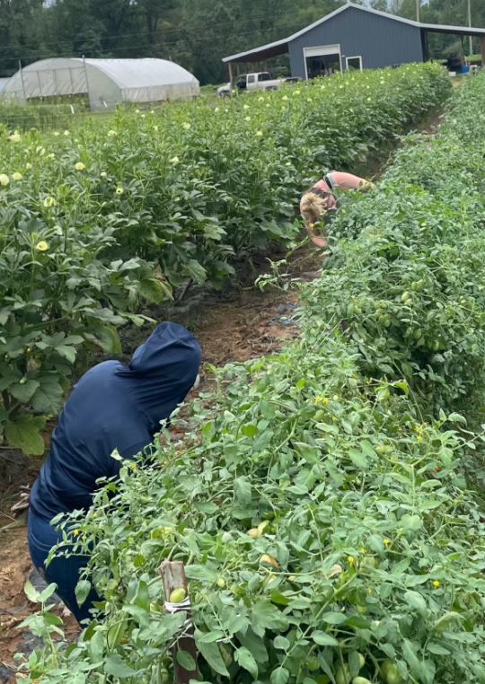 Kayla picking tomatoes in the high tunnel