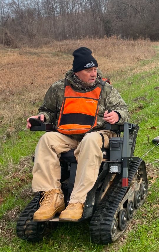 Randy in his EcoRover track chair towing the deer he harvested out of the lower field