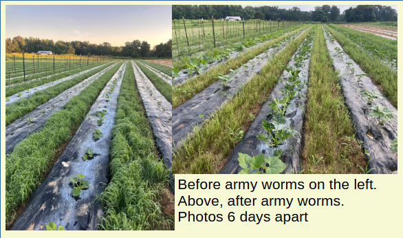 A before and after image of the destruction caused by the armyworms