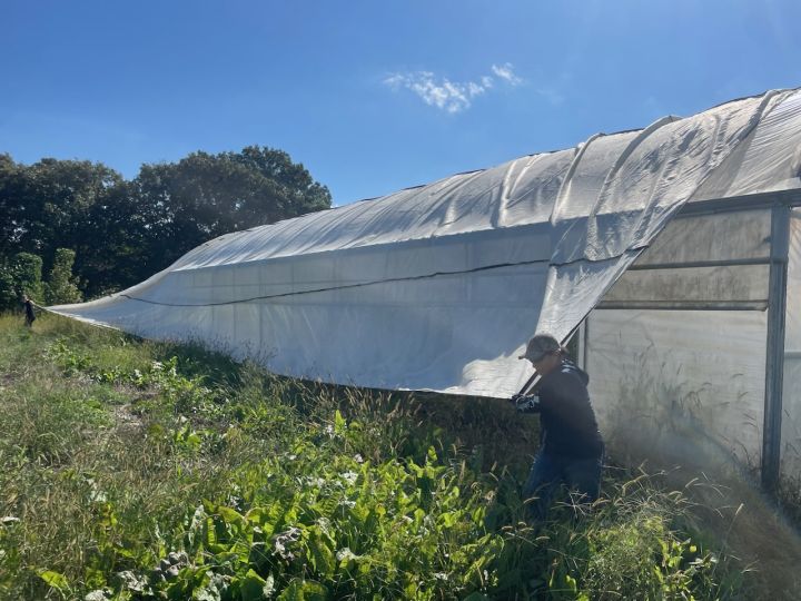 Pulling shade cloth off the high tunnels