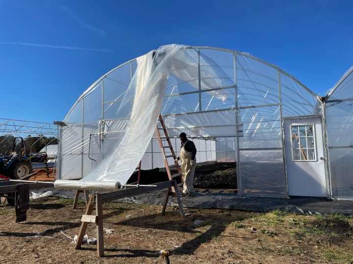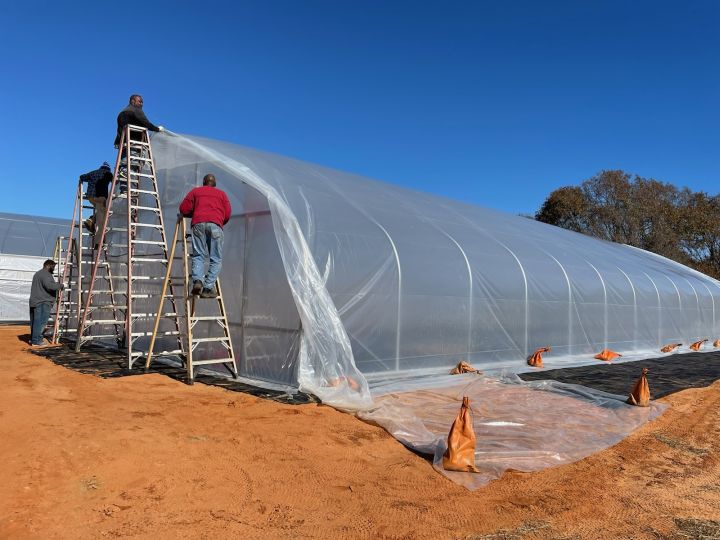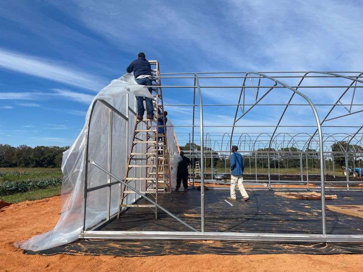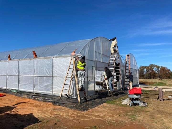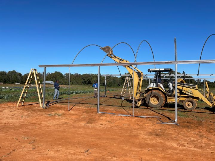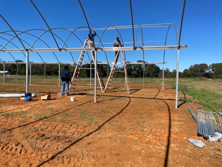 Our greenhouse has heat! Here is Mark and crew instaling the metal end wall supports