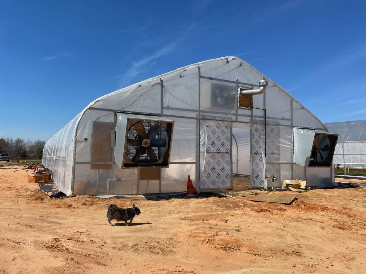 The old greenhouse we built in 2017 was 30 foot by 30 foot and upfront next to the old wash pack shed by the road. our new green house is more then double the space, just at 30 feet wide and 72 feet long. It has double layer poly on the roof and end walls, propane heat, circulation fans hanging from the cross braces, with thermostat controlled vents and exhaust fans.