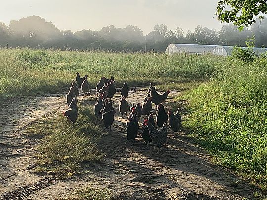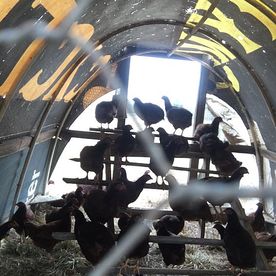 Young hens inside the mobile coop