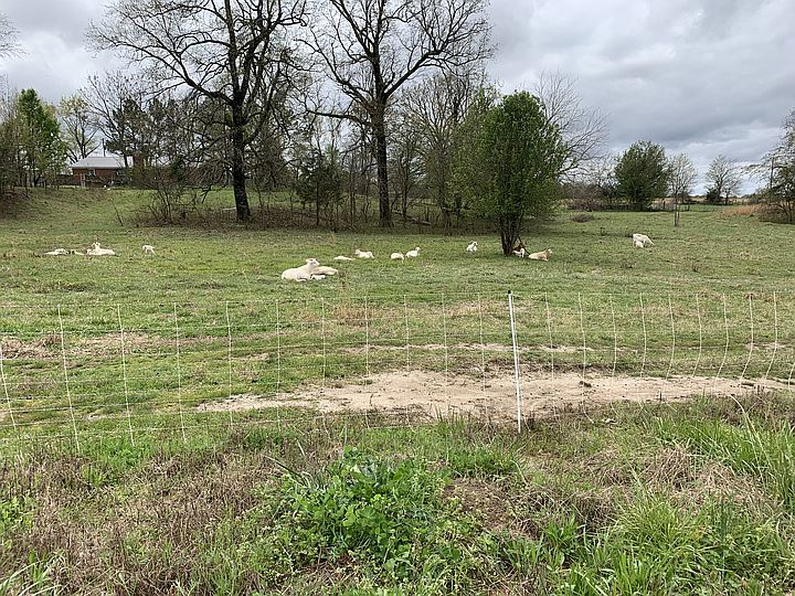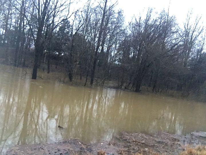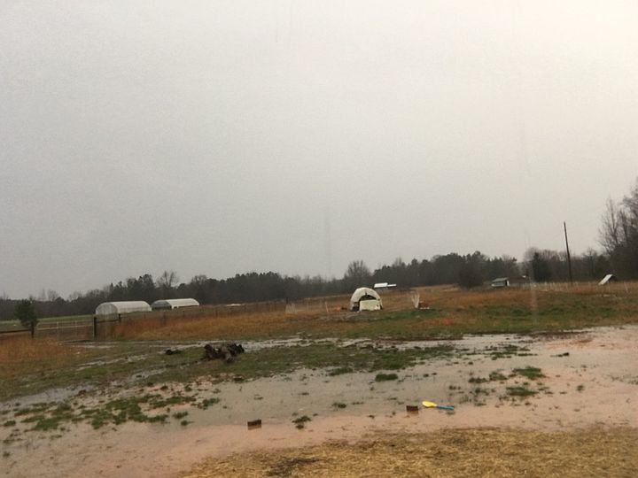 View from our house after several days of rain. Pasture has standing water, Movable chicken coop in slightly higher/dryer location