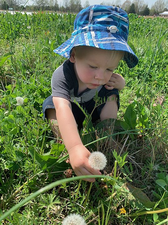Cooper picking dandelions