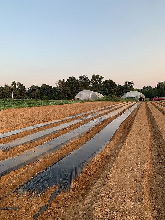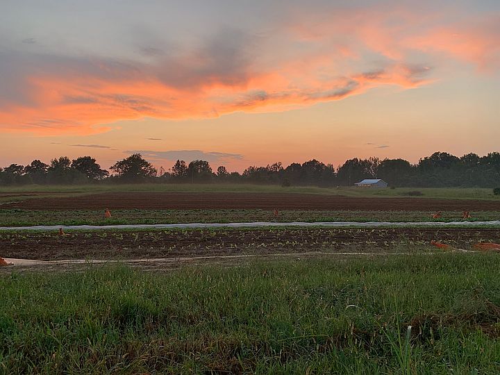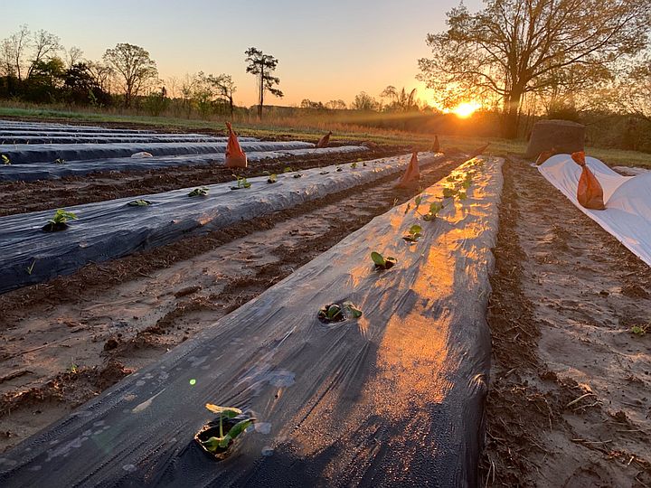 Day break, sun rising in background over beds of just planted cucurbits