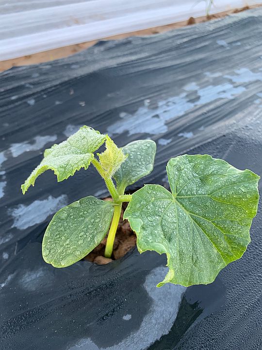 Close up of a cucumber plant in the field, with the bioplastic mulch