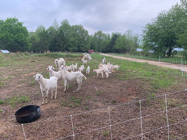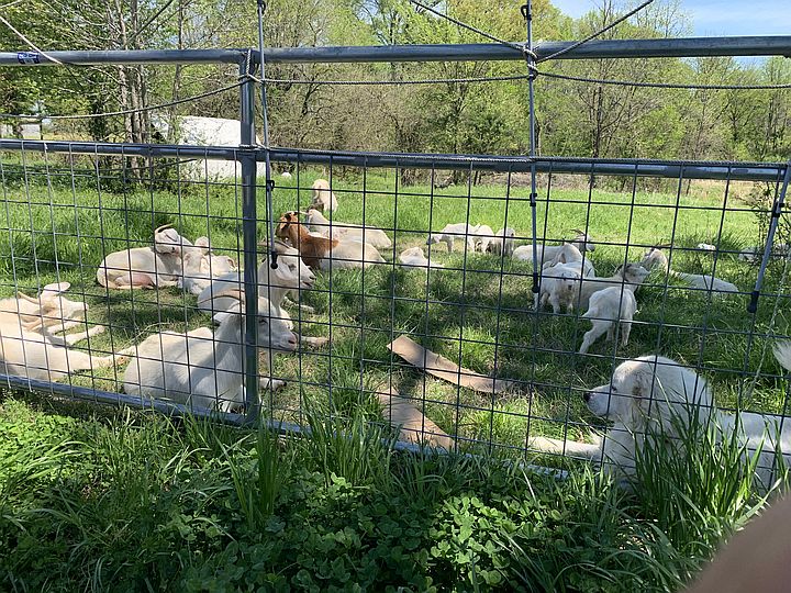 Goats on fresh pasture there are around 1 does and 22 kids in this picture