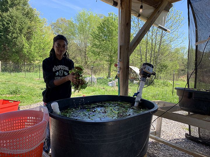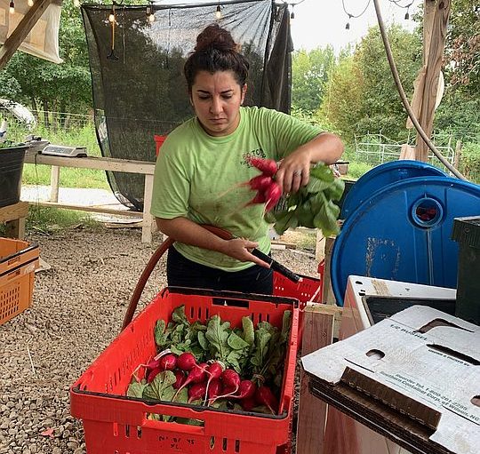 Sunshine working on rinsing, drying and packing our first CSA of 2019
