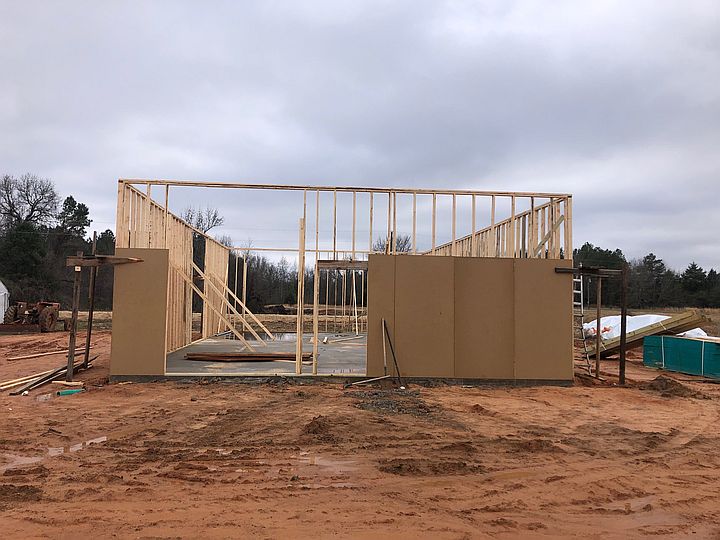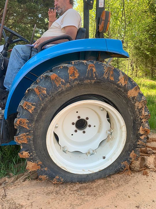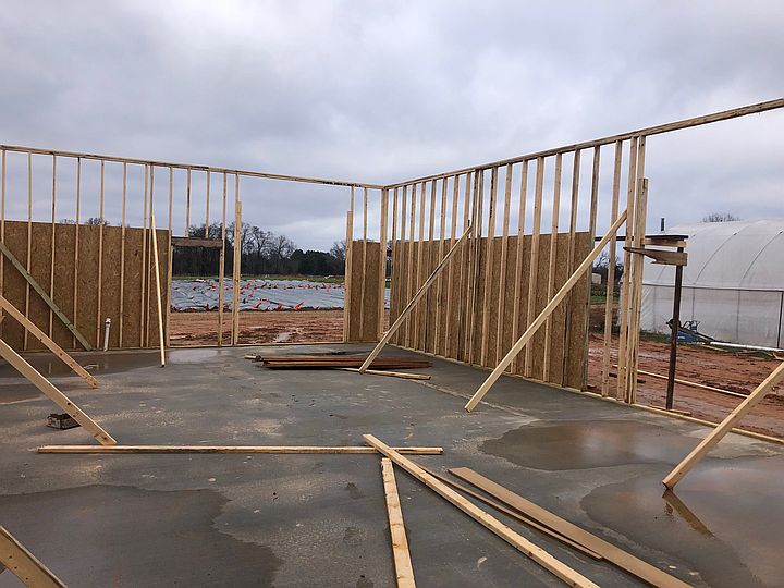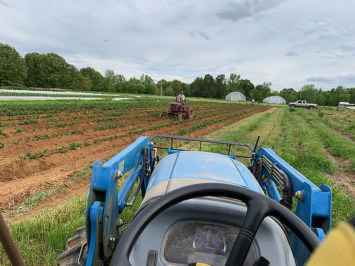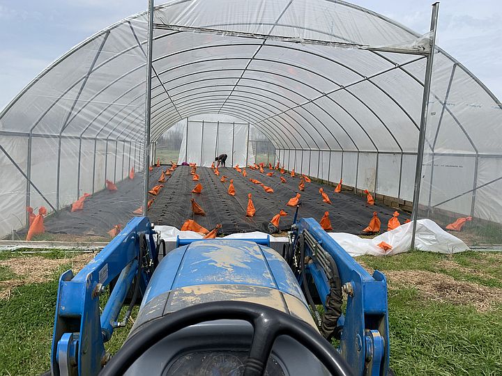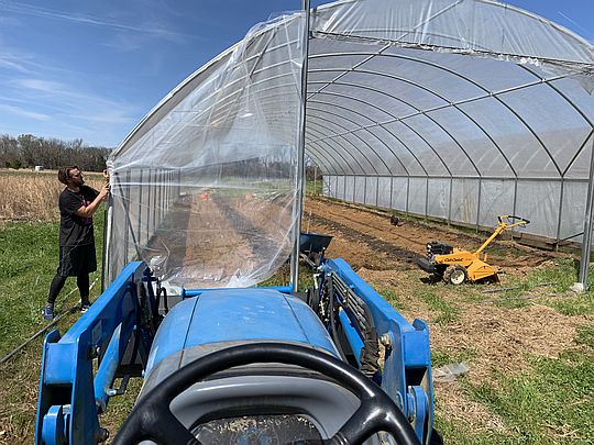 View from the tractor of Pat putting the end wall on the high tunnel