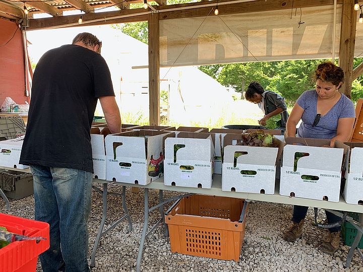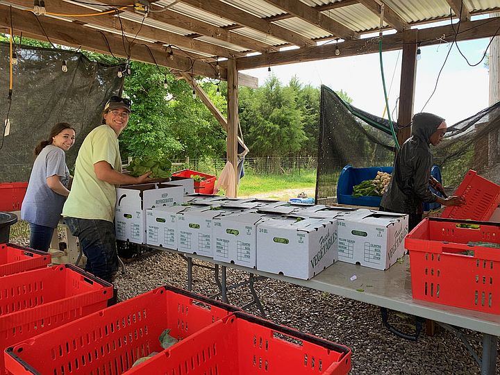 Patrick, Sunshine and Candice packing CSA shares