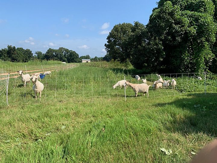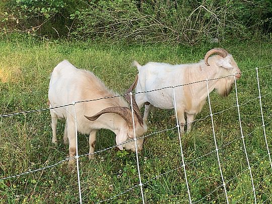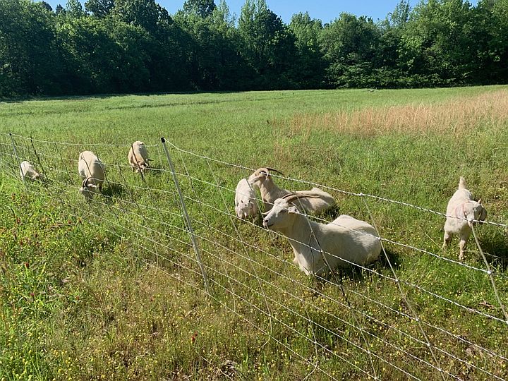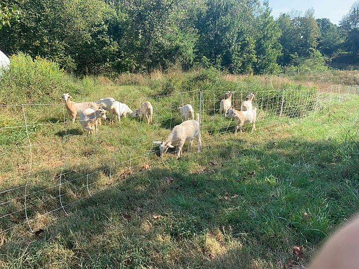 Some of our goats behind electric netting, on fresh grass with trees in background