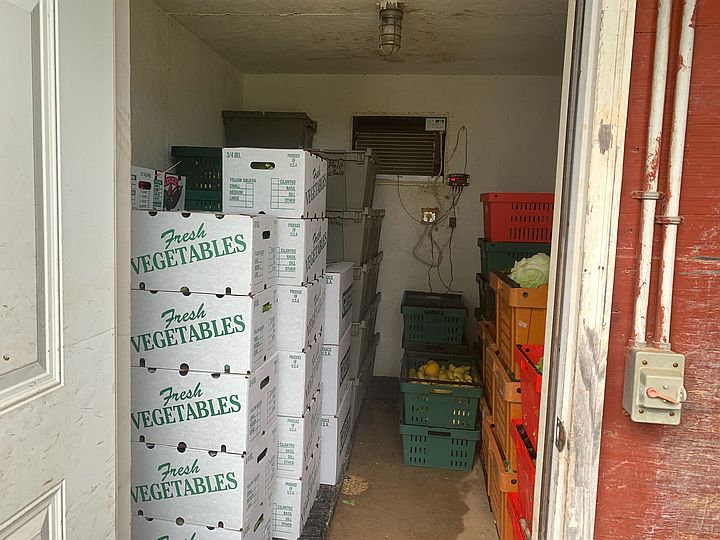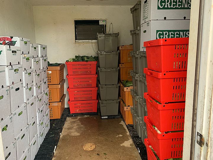 Packed walk-in, filled with boxes and rates of veggie