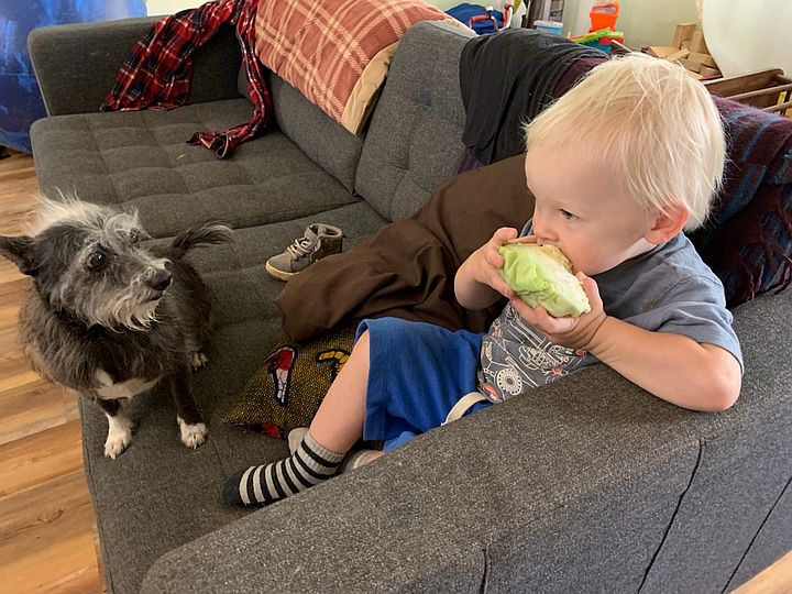Cooper enjoying a wedge of cabbage while Georgia looks on.
