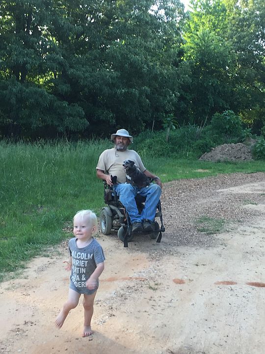Cooper running from daddy, Randy in his wheelchair with dog Georgia in his lap