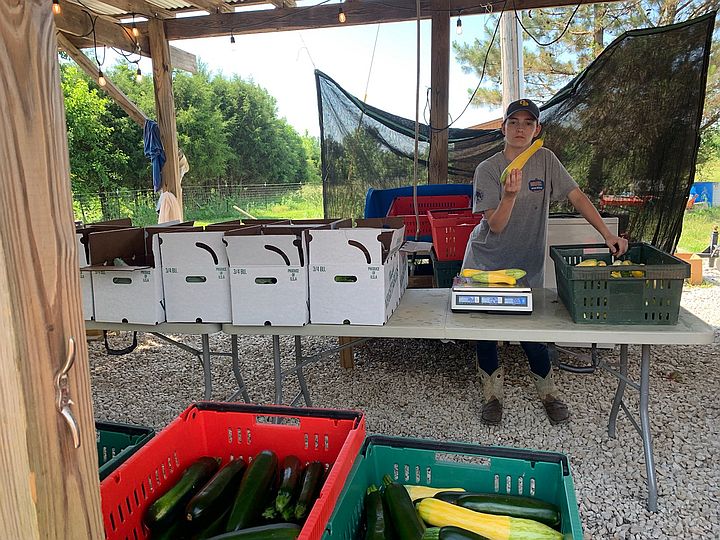 Newest team member, Victoria holding up squash while packing CSAs