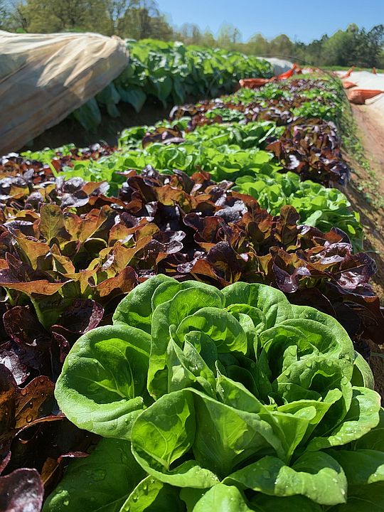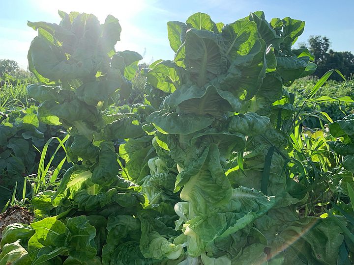 Red and green head lettuces growing in our field