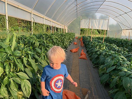 Cooper running through the pepper plants in the hightunnel.